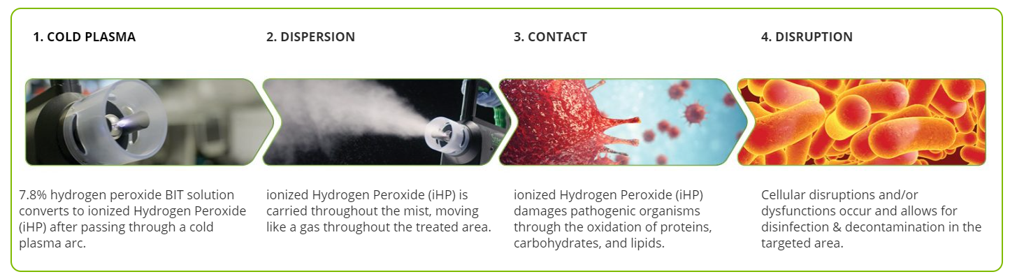 Patented Binary Ionization Technology (BIT) activates and ionizes a 7.8% Hydrogen Peroxide (H2O2) sole active ingredient-based solution into a fine mist/fog known as ionized Hydrogen Peroxide (iHP). iHP contains a high concentration of Reactive Oxygen Species (ROS), consisting mostly of hydroxyl radicals (•OH) is the killing agent. •OH are one of the most powerful oxidizing agents in nature, and during TOMI’s iHP process, kills bacteria and fungal spores and inactivates viral cells by destroying their proteins, carbohydrates, and lipids.