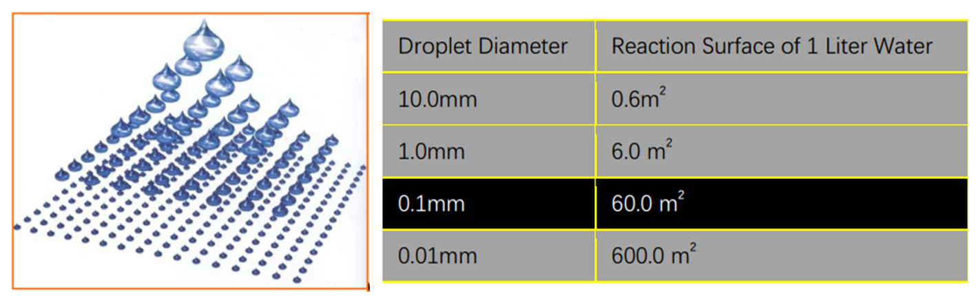 The misting nozzles can produce small droplets. The smaller droplet size the larger reaction surface. That is why the droplet size make a difference!